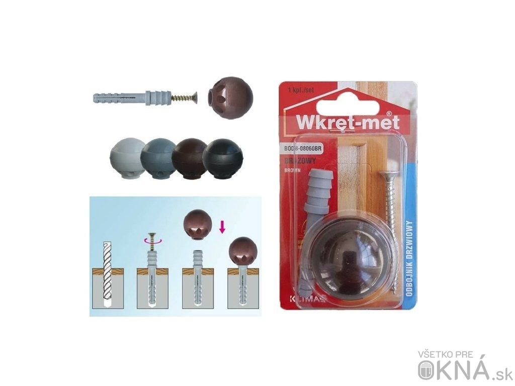 Doraz zabraňuje otváraniu dverí mimo požadovaný rozsah. Vŕta sa do podlahy, je dostupný v štyroch farebných prevedeniach.